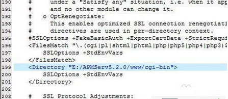 3、我们可以看到,系统已经帮我们记录了错误的起源地址D:/HySzWork/APMServ/Apache/conf/extra/httpd-ssl.conf 。是这个文件的第199行出现了问题,我们来看看是什么问题,如图