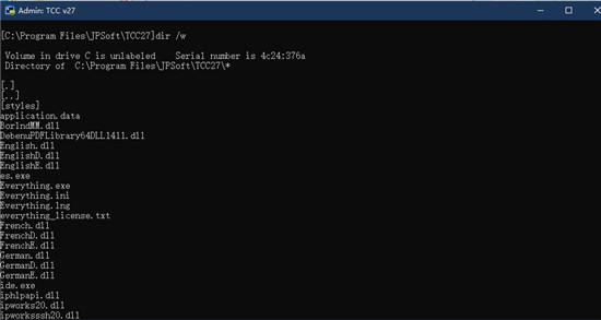 3、TCC脚本语言是Windows CMD shell的大型超集,具有245 +内部命令,395 +内部函数和299个系统变量。几乎所有的CMD命令行命令(例如DIR,COPY,DEL,START等)都增加了数百个附加选项。TCC增加了200多个新命令。TCC通常可以在一行或两行中完成,这需要几十个CMD命令(当CMD可以完成时)。