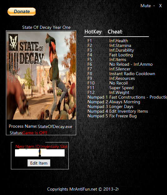 这个修改器简直是《腐烂国度周年版》玩家的福音,它提供了多达15项的修改功能,能让你彻底改变游戏体验。我个人觉得最实用的就是无限生命和无限子弹,这能让你在尸潮中横冲直撞,完全不用担心弹尽粮绝。除了这些基础功能,它还能实现超级加速、固定时间甚至瞬间广播冷却,这些功能极大地提升了游戏的自由度。使用起来也特别简单,下载解压后,先开修改器再开游戏,用热键就能一键搞定。虽然这可能会降低一些游戏原本的生存挑战感,但对于想轻松体验剧情或者单纯想发泄一下的玩家来说,这绝对是个不错的选择。 使用说明 1、首先下载修改器并进行解压 2、运行修改器 3、运行游戏 4、使用热键修改游戏 热键说明 F1:无限生命 F2: 无限体力 F3: 无限耐久 F4: 快速抢劫 F5: 无限物资 F6: 无限子弹 无限手榴弹 F7: 无限消音器 F8: 瞬间广播冷却 F9: 无限资源 F10: 没有后坐力 F11: 超级加速 F12: I无限载重 Num1: 快速建设 Num2: 一只白天 Num3: 更长的白天 Num4: 编辑库存物品 Num5: 冻结修复错误
