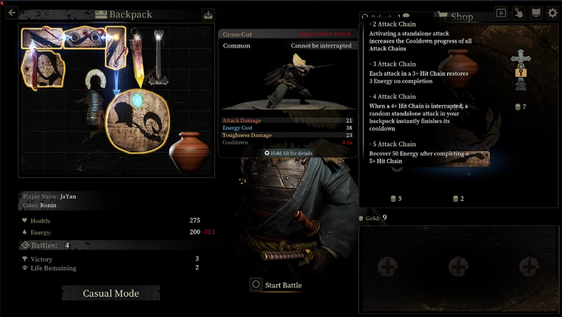 您可以通过道具赋予招式各种独特的buff,例如暴击、速度提升和格挡等。招式之间存在克制关系,连招亦是胜利的关键,比如设计巧妙的连招可以让你在破坏对手的架势后,迅速展开连续攻击。