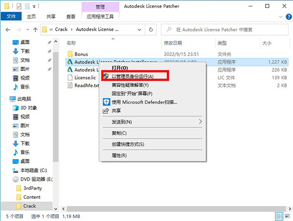 7、回到压缩包文件夹,在crack文件夹中以管理员权限运行“Autodesk License Patcher Installer.exe”