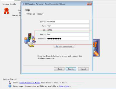5、在转入的界面中填写要连接数据库的userid和password,然后点击finish