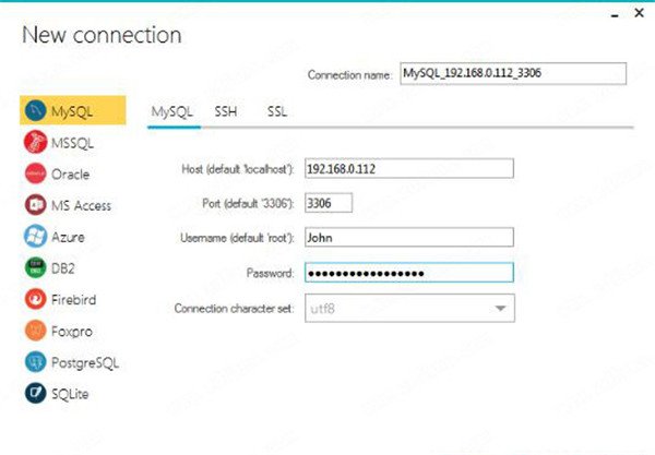 在新建连接窗口中,从支持的数据库列表中选择所需的数据库类型,通常需要IP地址,端口,用户名和密码作为设置数据库连接的必要信息。下面的图片显示了源MySQL节点和MS SQL目标节点作为此示例