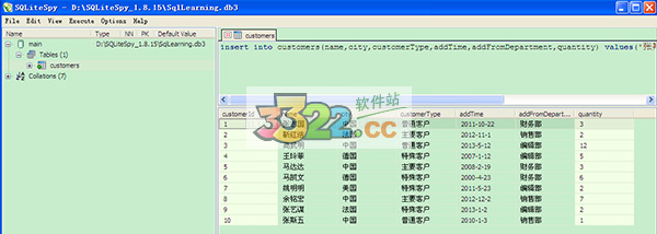 insert into customers(name,city,customerType,addTime,addFromDepartment,quantity) values('张志国','中国','普通客户','2011-10-22','财务部',3) ;