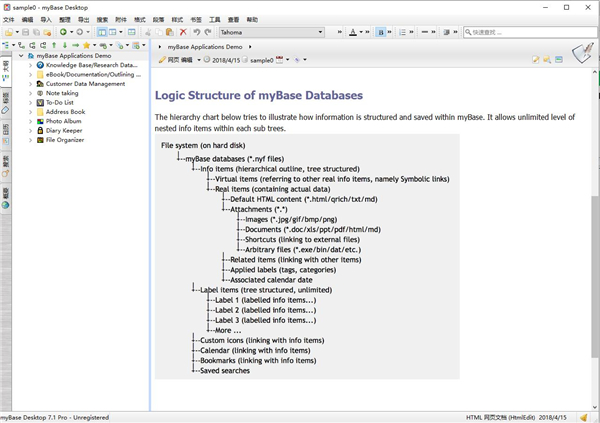 基本上,您可以组织树形图表单中的信息项目,myBase还实现其他组织方法,如项目链接,符号链接,日历链接和标签等。