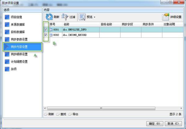 六、切换到 "同步内容设置" 选项卡,选择需要同步的数据库表;