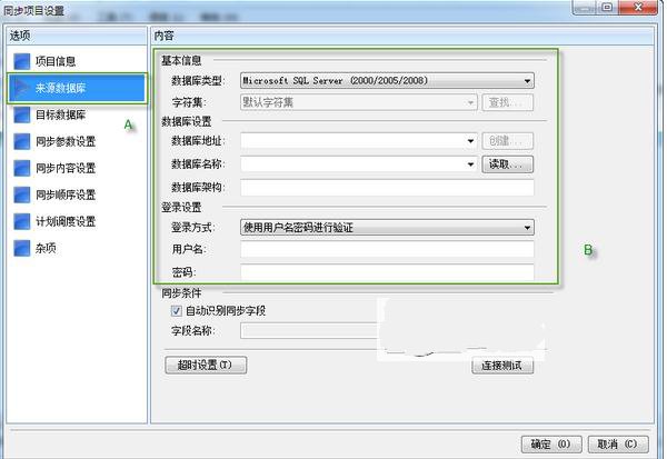 四、首先切换到 "来源数据库" 选项卡。填写同步的来源数据库信息(存放需要同步数据的数据库叫做来源数据库);