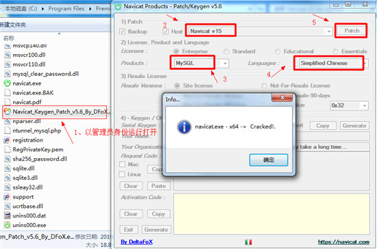 6、再以管理员身份运行注册机,然后如下图所示选择【Navicat v15】【mysql】【simplified chinese】