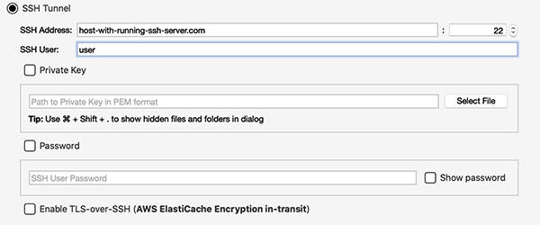 单击“SSH连接设置”中的“启用跨SSH的TLS”,并按照一节中的说明进行操作如何通过EC2连接到弹性缓存