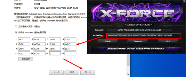 9、将生成的激活码复制到激活码输入框,点击“下一步”