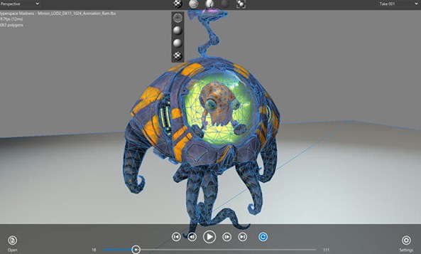 4.使用熟悉的播放、暂停和通过控件来检查动画3D资产。切换通过用户创建的相机保存在文件中