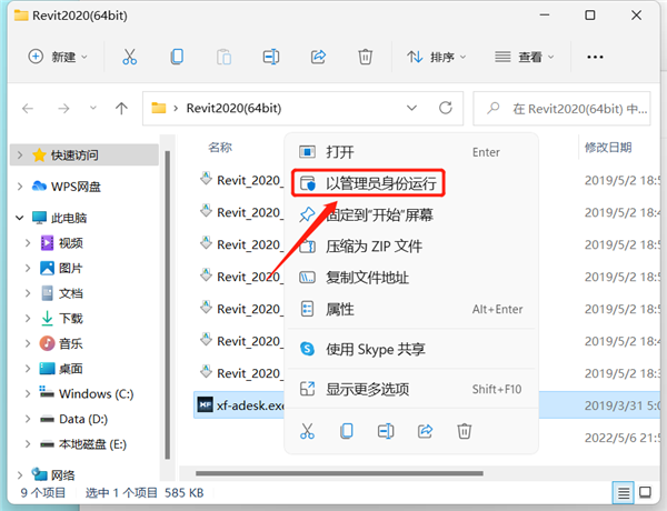 17、返回打开安装包解压后的Revit2020(64bit)文件夹,鼠标右键"xf-adesk”选择以管理员身份运行。注意运行"xf-adesk”前【先关闭“所有杀毒软件(部分电脑自带的“迈克菲”也要关闭)、防火墙、Windows Defender”】