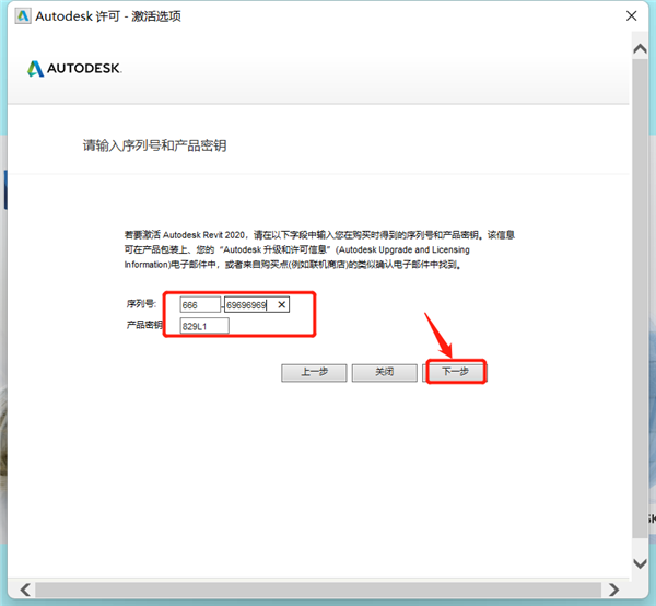 15、接着再次输入序列号【666-69696969】和产品密钥【829L1】,点击【下一步】按钮;
