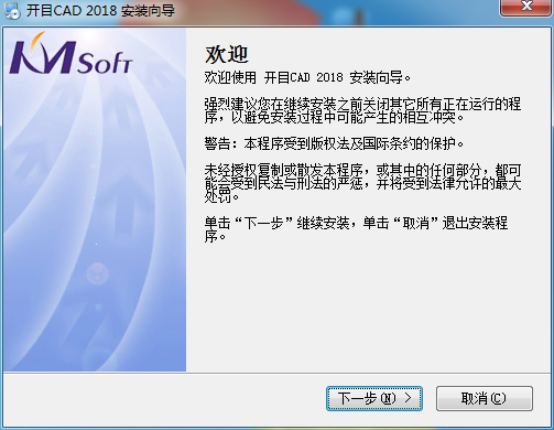 1、首先鼠标双击右键解压软件压缩包,之后解压,双击软件安装文件,进入欢迎安装开目CAD 2018界面,开始软件安装向导,并点击下一步