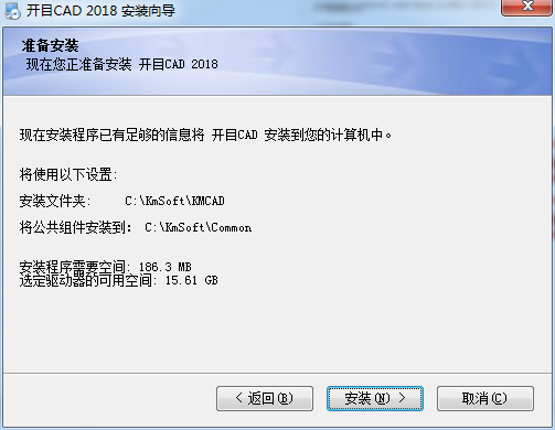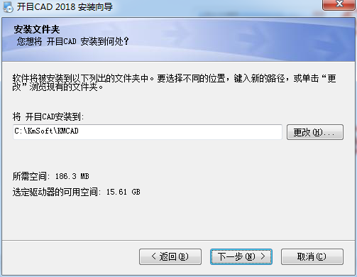 4、选择软件开目CAD 2018安装文件夹,系统设置的是“C:\KmSoft\KMCAD”,可以点更改修改,下一步
