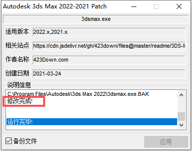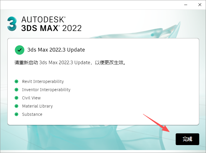 12、当提示修改完成时,说明软件已经完美激活,你可以无限制使用3ds Max 2022了。