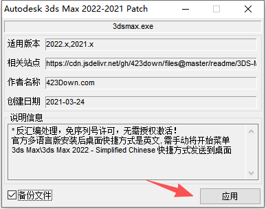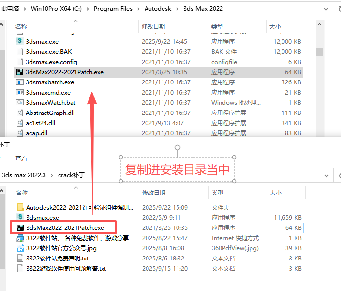 9、解压crack补丁,找到软件的安装路径,把3dsMax2022-2021Patch.exe复制进安装目录当中,如下图所示;