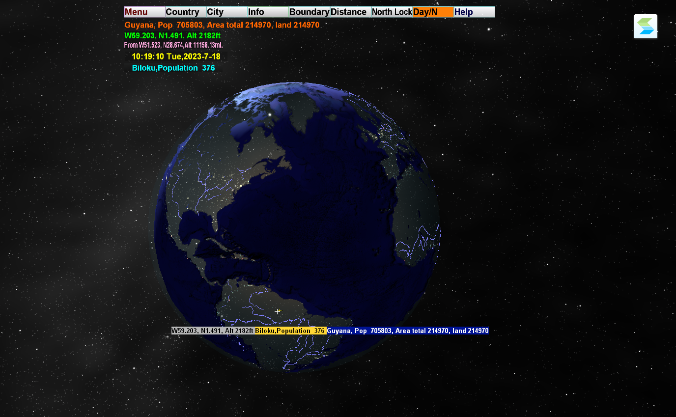 1、Menu(主菜单)可以实现软件的所有功能,包括显示特定国家,显示特定地区或者城市,显示/关闭城市列表,显示/关闭河流、国界、黑夜效果等。