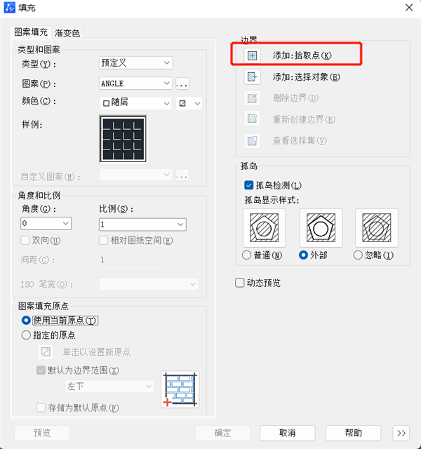 1、点击左侧工具栏的【图案填充】,在弹出的对话框中,点击左边的【添加:拾取点】,选取需要填充的图形。