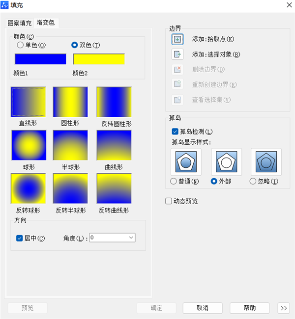 单色的填充可能不足以满足大家对制图的需要,此时可以使用渐变色进行填充让图纸更加精美。我们可以选择单色或者双色渐变,根据自身需要更换渐变的颜色。