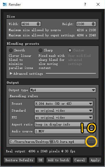不要被那么多选项吓蒙,绝大部分保持默认就好。点击圈10的位置(输出文件选择按钮),选择输出视频文件的位置,也可以手动修改此按钮左边的输入框中的文件路径和文件名。完事后点击OK按钮。