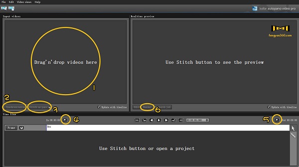 1、添加视频素材。我们把相机拍出来的视频素材拷贝到同一个文件夹下面,按顺序重命名。比如蜂眼相机,由1到4号共四台子相机组成,拍出来的视频格式均为mov。那么就把这四个视频放到同一个文件夹下面,并依次重命名为1.mov,2.mov,3.mov和4.mov。然后全选并拖放到AVP中圈1的位置。