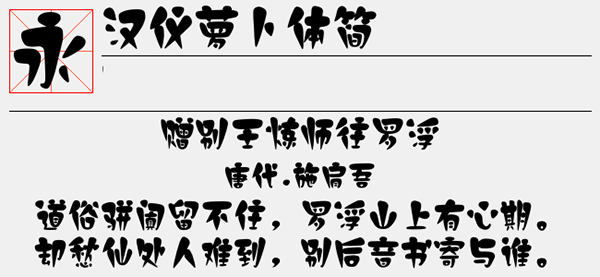汉仪萝卜体简字体是一款汉仪类萝卜形状风格字体软件,该字体上边粗下边细,笔画粗壮活泼,构思新颖,风格独特。整体结构为上宽下窄,主要笔画上边宽大粗壮,下边由粗渐小、渐细,似箩卜形状。具有醒目,突出的视觉效果,可以适应于报纸和杂志和书籍中常用字体海报、个性促进品牌标志设计、字体设计、文本装潢、信息展示、篆刻制模英文、数据制作、装潢设计、视觉设计、字帖等一切合法应用场景,有喜欢的朋友可免费下载收藏。