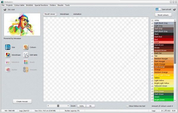 该Brickaizer软件是能够创造完美的颜色匹配与所有可能的组合颜色和大小。使用了几种高精度的颜色匹配引擎,包括彩色和黑白抖动,以及Mosaizer XV颜色匹配引擎。即使从近距离可以看到美丽的照片,不需要离开5米,以消除不匹配的颜色补丁。