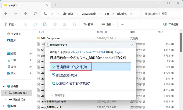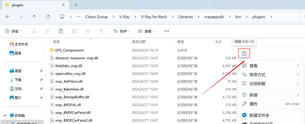 12、回到VRay 6.1 for Revit 2019-2024文件夹,找到【vray_BRDFScanned.dll】文件,右键点击【复制按钮】。