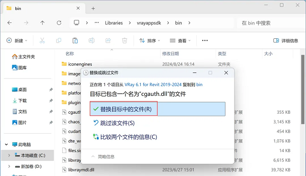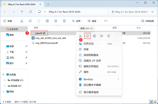 7、回到VRay 6.1 for Revit 2019-2024文件夹,找到【cgauth.dll】文件,右键点击【复制按钮】。
