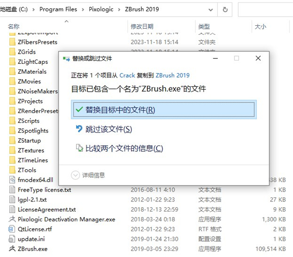 3、拷贝ZBrush.exe到安装目录下(默认C:\Program Files\Pixologic\ZBrush 2019),替换即可。