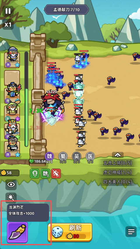 在玩法上,乱弹三国志谋略版采用抽卡塔防模式,玩家需抽取武将卡牌来抵御一波波敌人。同时,游戏内设丰富的羁绊效果,例如集齐刘备麾下的“关赵张马黄”即可激活五虎上将羁绊,大幅提升队伍战斗力!