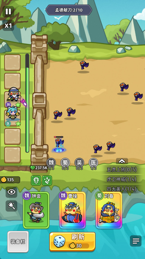 乱弹三国志谋略版是一款融合三国题材与塔防玩法的卡牌策略游戏,采用独特的可爱Q版画风,将赵云、张飞等名将塑造为圆滚滚的讨喜形象。游戏中设有魏、蜀、吴、医四大阵营,分别以曹操、刘备、孙权、华佗为核心,玩家可收集众多历史武将自由组建卡组,并通过预设卡组功能灵活调整阵容。