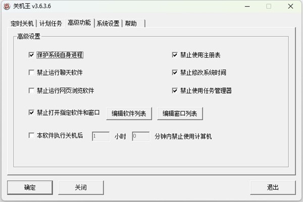 3、可以禁止运行聊天软件、禁止打开指定软件窗口、禁止运行网页浏览软件,设定开机后指定时间内就自动关机或断网,方便于家长对小孩的监控,养成良好的用电脑习惯,保护眼孩童视力。