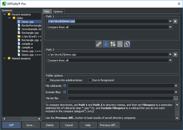 1、新的简化设置对话框。是文件名,还是文件夹名?只需输入,DIFFzilla就会知道了。还有完成和一个菜单来选择文件、文件夹或缓冲区(甚至是未命名的)