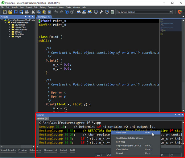2、支持运行构建工具、grep工具(如果您没有sgrep工具,SlickEdit附带一个),以及使用SlickEdit现有的“下一个错误”和“上一个错误”功能遍历错误消息。按Alt+1(在大多数仿真中)选择要处理“下一个错误”和“上一个错误”命令的终端或构建窗口