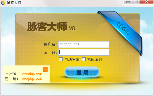 默认用户名:cvcphp.com 默认密码:cvcphp.com二级登录密码:www.cvcphp.com 或者 cvcphp.com