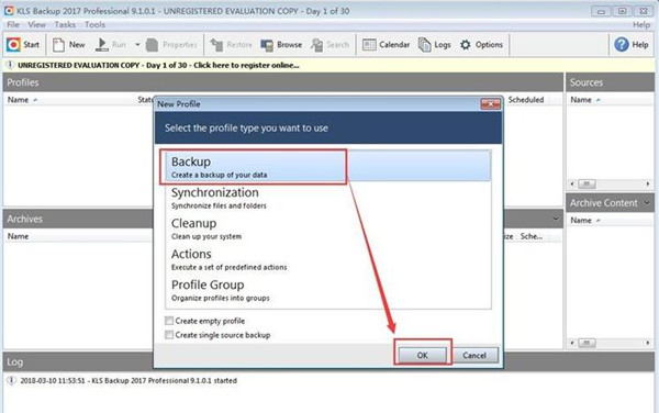 2、在新建任务窗口中选择[Backup],点击[OK]确定建立备份任务