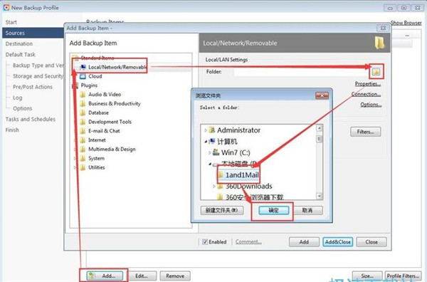4、这一步我们需要添加备份文件夹。点击任务设置窗口中的[Add],打开文件夹选择窗口,点击文件夹路径框右边的文件夹按钮,打开文件夹选择窗口。选择好想要备份的文件夹后,点击[确定]就可以完成文件夹添加,文件夹添加完成,点击[Next]继续下一步