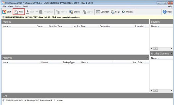 1、首先打开点击KLS Backup软件,点击主界面顶部工具栏中的[New]打开新建任务窗口