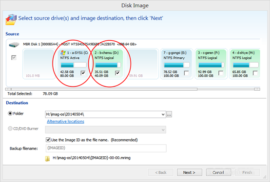 6、勾选需要备份的系统盘和数据盘选择好保存目录点击“next”在点击“finish”完成系统和数据备份