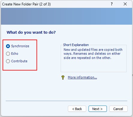 注意:选择包含大量文件的文件夹可能会导致 SyncToy 执行任务的时间延长。