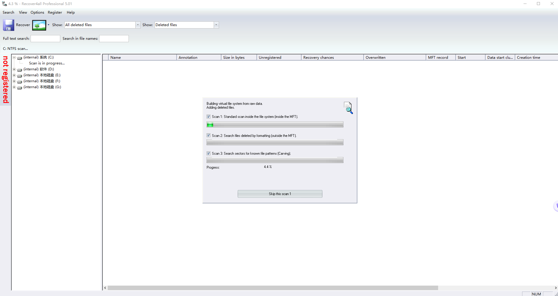 答:遇到这种情况,可以将软件卸载后,重新安装到另一个盘,或者是在软件中选择其他模式进行扫描。