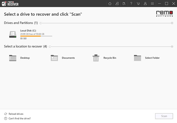 Remo Recover是来自国外的一款专业数据恢复软件,主要用于恢复回收站、误删除、格式化等文件,适用于解决所有windows用户的数据恢复故障,即使是更糟糕的情况下也能进行数据恢复,不仅能将恢复的数据保存到CD / DVD或任何可访问的驱动器,还可以在实际恢复之前预览恢复的数据。Remo Recover功能强大,识别和恢复多达300种文件类型,其中包括文档,电子表格,电子邮件存档,zip存档和其他重要文件类型在他们独特的签名上。Remo Recover可以恢复恢复数据即使在重新安装Windows之后也可从格式化分区、从已删除或无法访问的分区中、即使硬盘驱动器崩溃或无法引导时恢复数据等。支持从SATA / SCSI / IDE硬盘驱动器,SD,XD,MMC闪存卡,外部USB驱动器,FireWire驱动器,iPods 恢复数据从FAT16,FAT32,NTFS,NTFS5, ExFAT分区/驱动器。