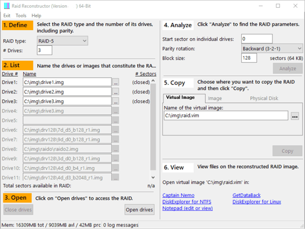 因为一个驱动器在RAID 5中是冗余的,所以其数量少于阵列中原始驱动器数(N)就足够了。RAID Reconstructor可以从N-1个驱动器重新计算原始数据。对于RAID-0(条纹)阵列,将需要所有驱动器。
