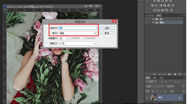 然后会弹出一个对话框,设置这个动作的名称,为了方便管理,我一般都会给动作设定一些分组,比如这个动作是用于调色的,我就分到了“调色”的组里面。如图2所示