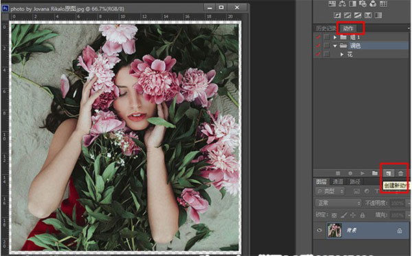 首先将一张JPG格式的原图拉进Photoshop软件,选择「动作」,创建一个新动作,如图1所示