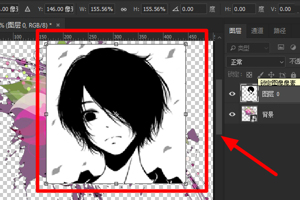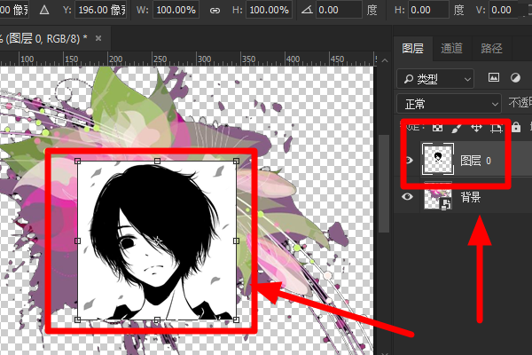1、将新的图片插入到ps中,用鼠标点击插入图片的图层,然后同时按住键盘上的“Ctrl”键+“T”键打开自由变换,这时被选中的图层将会被一个矩形围住: