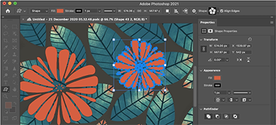 此版本中,您可以在使用自定形状工具时,从形状属性面板中控制自定形状的选项,包括宽度、高度、角度、翻转、复位和外观。此外,现在您还可以使用画布上的“变换”控件来变换自定形状,同时保持其形状属性不变。