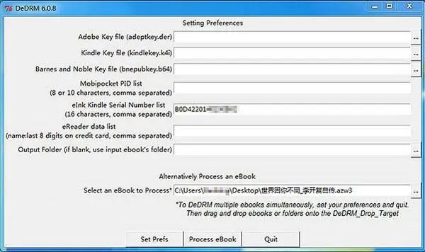 在【eInk Kindle Serial Number list】一栏中填写你的 Kindle 序列号,然后点击下方的【Set Prefs】按钮保存。接下来,点击界面下面的【Select an eBook to Process】一栏后面的【…】按钮,选择电子书,点击【Process eBook】即可完成破解。